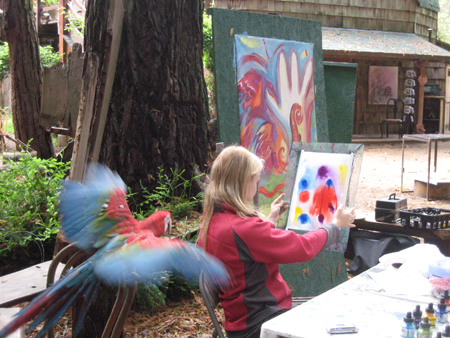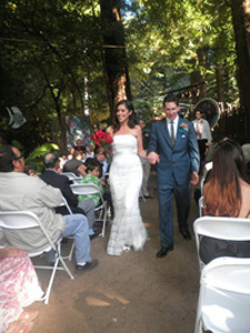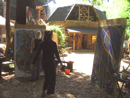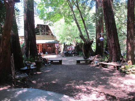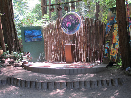 We have a beautiful stage and sacred circle which is surrounded by a cathedral of Redwood Trees.
